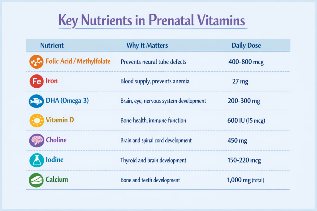 One important note: prenatal vitamins are designed to supplement a healthy diet, not replace it. DHA (from fatty fish or algae), calcium (from dairy, leafy greens, or fortified foods), and choline (from eggs) are nutrients your prenatal may only partially cover – and that’s intentional. If you have specific health conditions, a history of pregnancy complications, or dietary restrictions, talk to your doctor or midwife before choosing – this guide is a starting point, not a prescription.